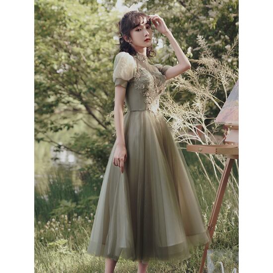 結婚式ドレス 大きいサイズ XL 2XL 半袖 シースルー エレガント ミドル丈 Aラインスカート 体型カバー 花柄 ボリュームスカート フェミニン チョーカー風 お呼ばれ 演奏会ドレス お洒落