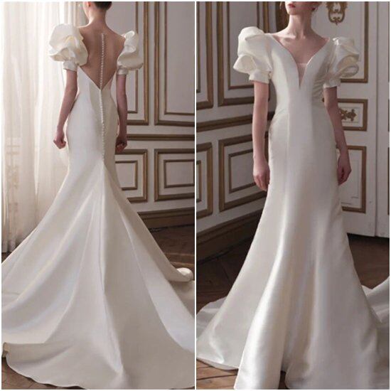ウェディングドレス 大きいサイズ 2XL フィッシュテール ハイウエスト パフスリーブ サテン Vネック シンプル 美シルエット 結婚式ドレス フォーマル エレガント スタイリッシュ ワンピースドレス