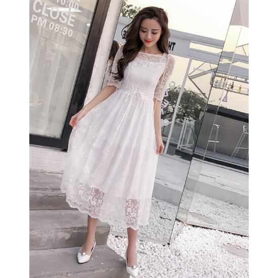 結婚式ドレス レディースワンピース 半袖 ミドル丈 大きいサイズ XL エレガント ワンピースドレス 花刺繍 フェミニン 袖あり 上品 お洒落 お呼ばれ フォーマル 総レース Aラインスカート