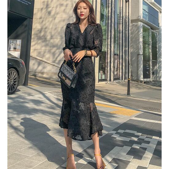 結婚式ドレス ワンピースドレス 大きいサイズ 2XL 3XL 袖あり パフスリーブ ボリューム袖 お呼ばれ フォーマル エレガント Vネック マーメイドスカート 総レース 体型カバー ロングスカート