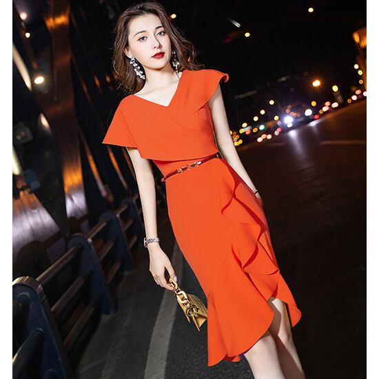 結婚式ドレス ワンピースドレス 大きいサイズ XL 2XL 半袖 イブニングドレス お呼ばれ フォーマル エレガント Vネック フィッシュテール 膝丈スカート フリル カジュアルドレス 上品 おしゃれ