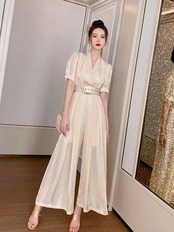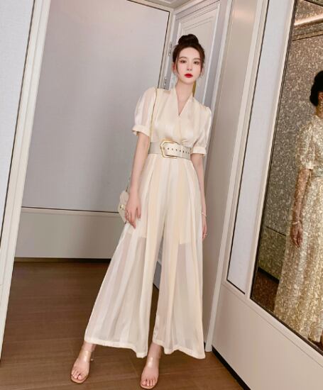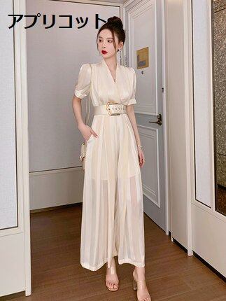 オールンワン レディース ジャンプスーツ パンツドレス Vネック ワイドパンツ ウエストベルト エレガント きれいめ お呼ばれ 結婚式 パーティー オールンワン レディース ジャンプスーツ パンツ