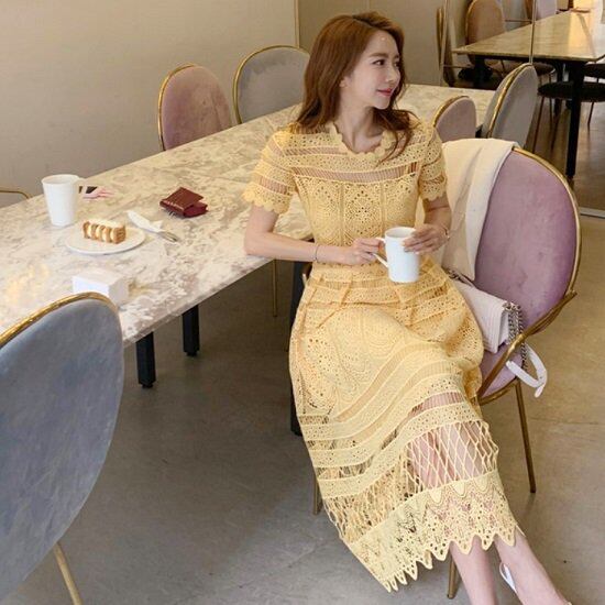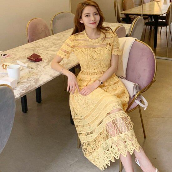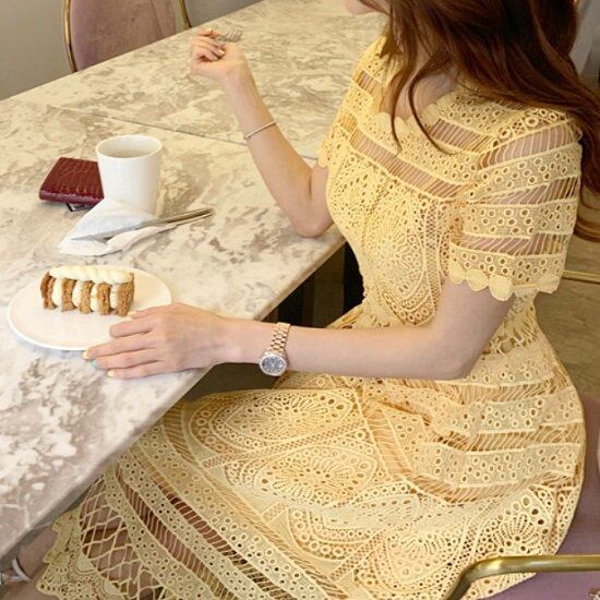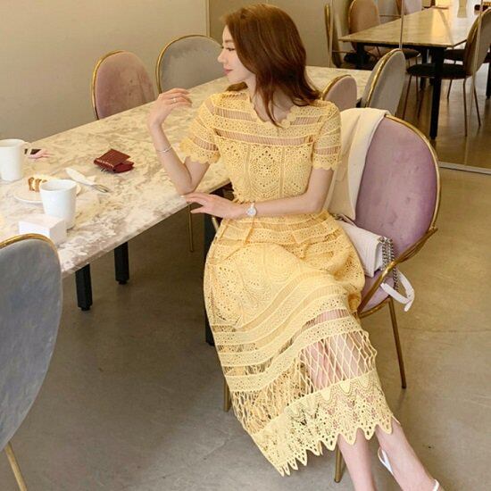 ドレス ワンピース レース柄 半袖 ワンピースドレス シースルー イエロー かわいい ドレス ワンピース お呼ばれ 発表会 ワンピースドレス 演奏会 二次会 おしゃれ ドレス ワンピース レース柄