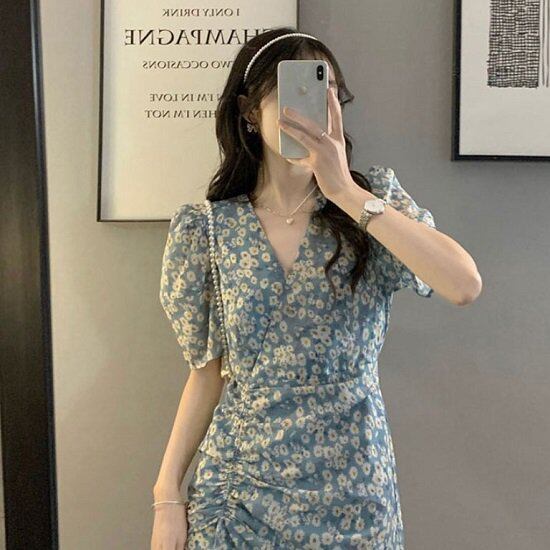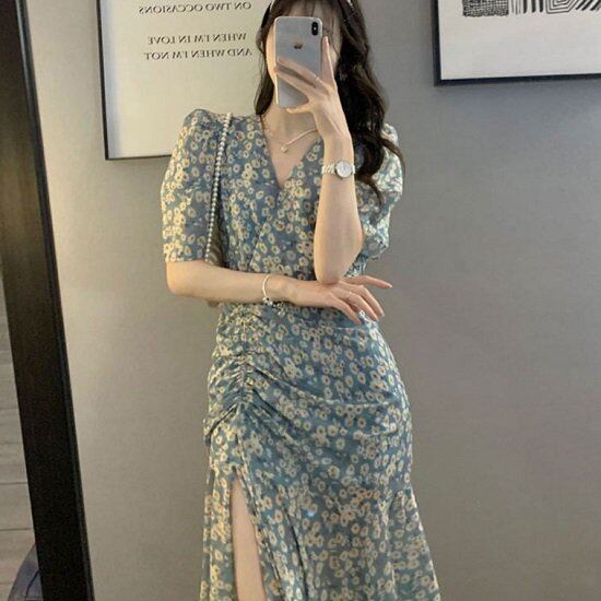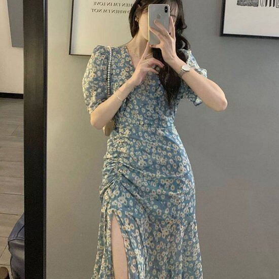 ドレス ロング丈 花柄 スリット ブルー ロング丈ドレス ワンピース エレガント セクシー お呼ばれ ドレス ワンピース 半袖 Vネック おしゃれ ドレス ロング丈 花柄 結婚式 二次会 エレガント
