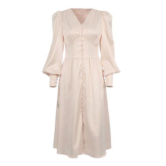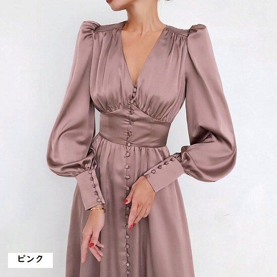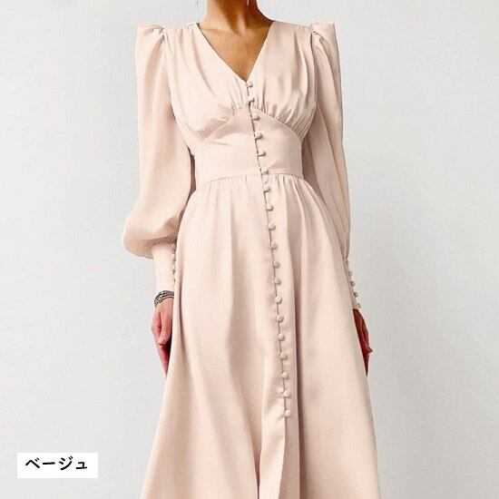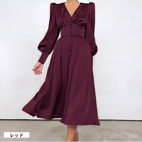 ドレス ワンピース ロング丈 Vネック ワンピース ドレス 長袖 ボタンデザイン ドレスワンピース 大人 シック お呼ばれ ワンピースドレス ハイウエスト スタイルアップ ドレス ワンピース ロング丈