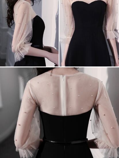 腕と胸元のシースルーデザインがエレガントなパーティードレス。