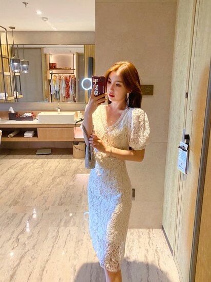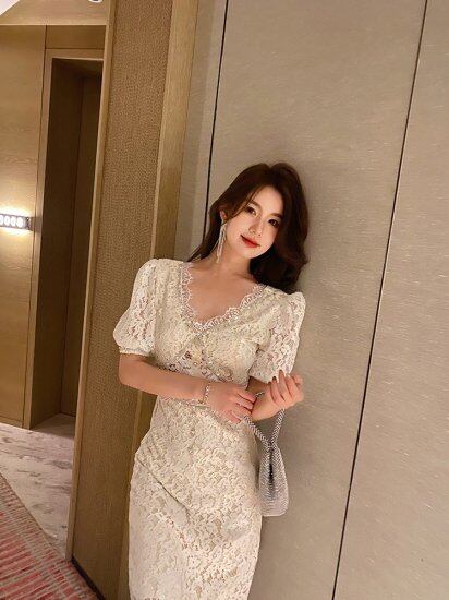 パーティードレス レディース 結婚式ドレス ワンピースドレス 演奏会ドレス Vネック 膝丈 Vネック 総レース 半袖 きれいめ お呼ばれ おしゃれ ハイウエスト エレガント パフスリーブ