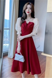 パーティードレス レディース ワンピースドレス 膝丈 結婚式ドレス 演奏会ドレス イブニングドレス パフスリーブ スパンコール レッド ブラック 赤 黒 お呼ばれ エレガント きれいめ
