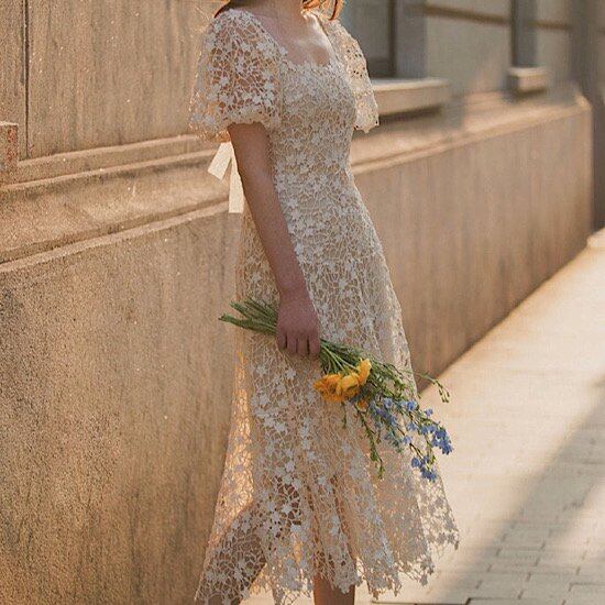 結婚式ドレス パフスリーブ イブニングドレス レース ミモレ丈 発表会 演奏会 レディース フレアドレス 結婚式 ステージ衣装 半袖 エレガント ウエディングドレス Aライン スクエアネック