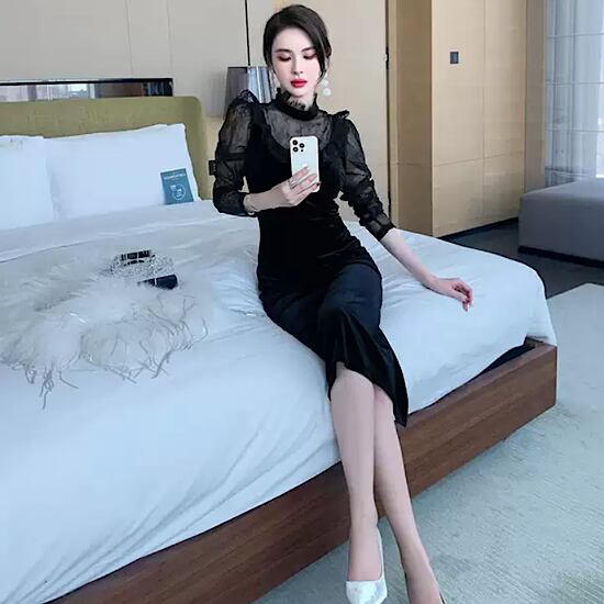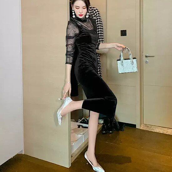結婚式ドレス レース スリム 長袖 高級感 リッチ ベルベット 発表会 演奏会 レディース 結婚式 ステージ衣装 ミモレ丈 エレガント ウエディングドレス スリット入り 細身 シースルー