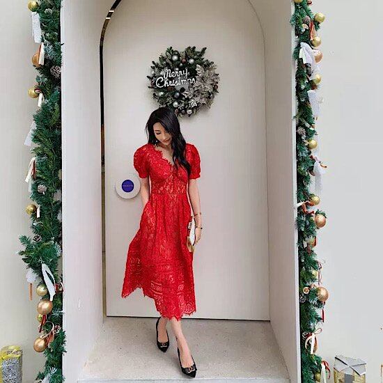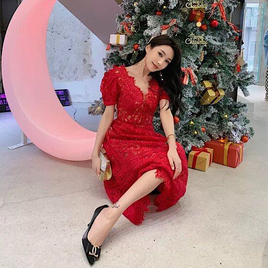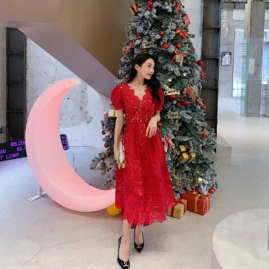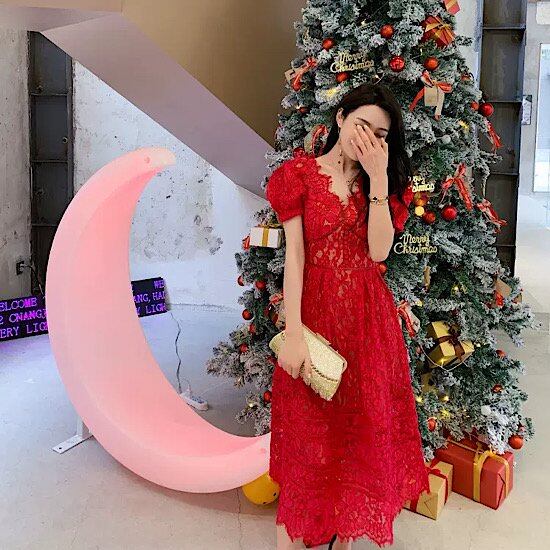 結婚式ドレス 総レース ミモレ丈 深Vネック レトロ ハイウエスト 発表会 演奏会 レディース 結婚式 ステージ衣装 半袖 エレガント ウエディングドレス カラードレス プルオーバー