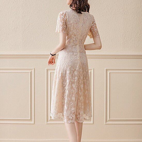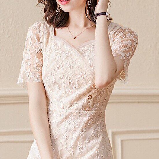結婚式ドレス レース フレンチ スリム ハイウエスト 膝丈 発表会 演奏会 レディース フレアドレス 結婚式 ステージ衣装 半袖 エレガント ウエディングドレス カラードレス ジッパー