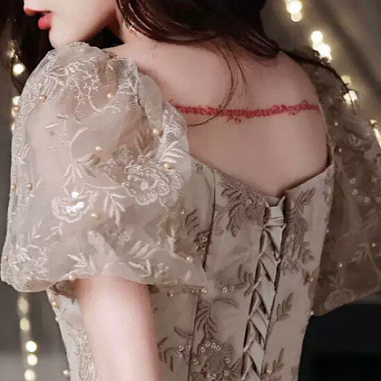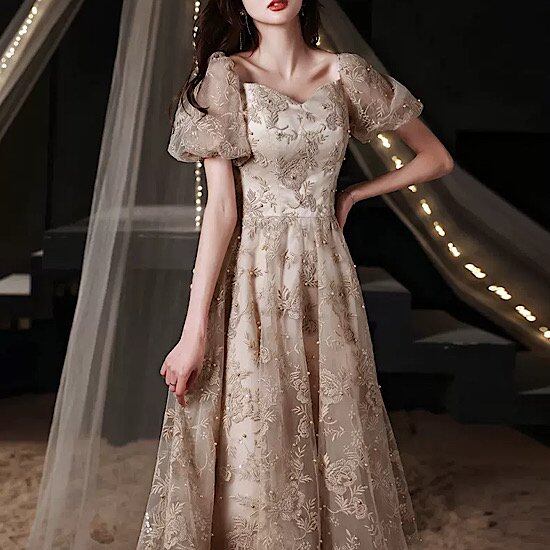 結婚式ドレス 総レース 刺繍 ミモレ丈 パフスリーブ イブニングドレス 発表会 演奏会 レディース フレアドレス 結婚式 ステージ衣装 半袖 ロング丈 エレガント ウエディングドレス カラードレス