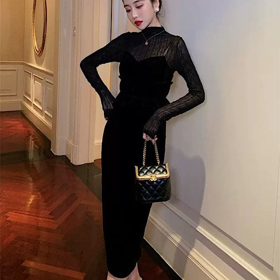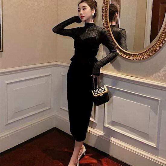 結婚式ドレス ベルベット 長袖 ハイネック スリム 発表会 演奏会 レディース スリムドレス 結婚式 ステージ衣装 ミモレ丈 エレガント ウエディングドレス カラードレス 高貴 ウェーブ