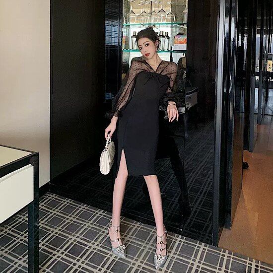 結婚式ドレス メッシュ Vネック ドット柄 スリット入り シースルー 膝丈 発表会 演奏会 レディース フレアドレス 結婚式 ステージ衣装 長袖 エレガント ウエディングドレス カラードレス