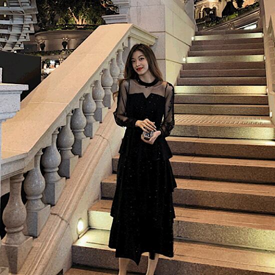 結婚式ドレス メッシュステッチ ティアードスカート レイヤード 発表会 演奏会 レディース 結婚式 ステージ衣装 長袖 ミモレ丈 エレガント ウエディングドレス カラードレス キラキラ
