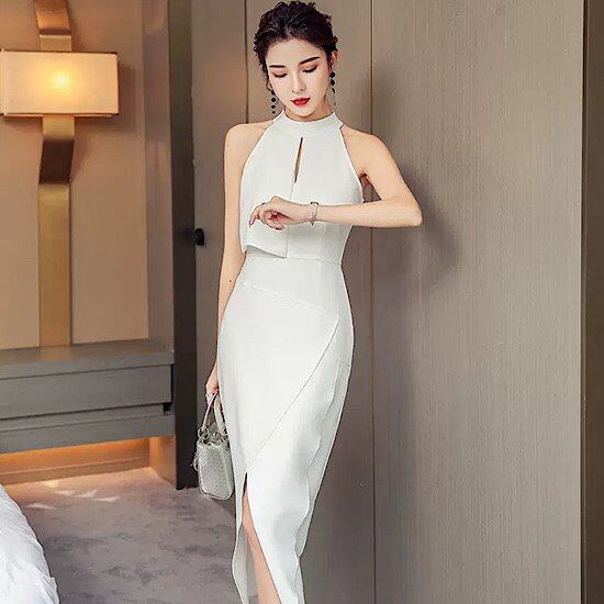 結婚式ドレス ホルターネック セクシー スリムフィット スリット入り 無地 ミモレ丈 発表会 演奏会 レディース 結婚式 ステージ衣装 ノースリーブ エレガント ウエディングドレス