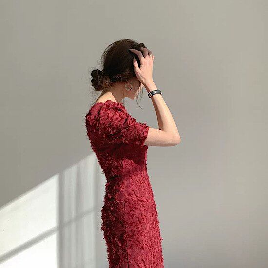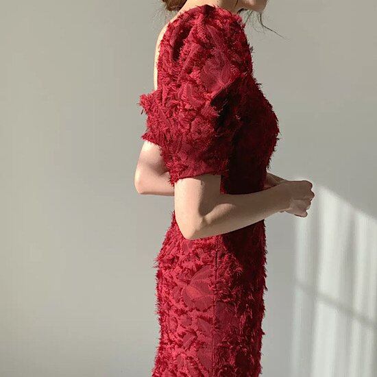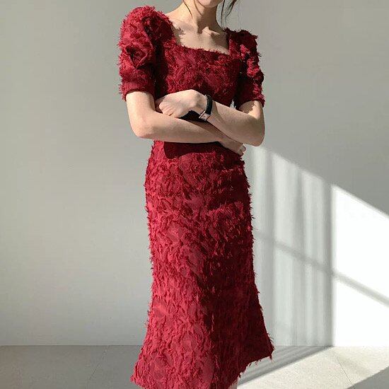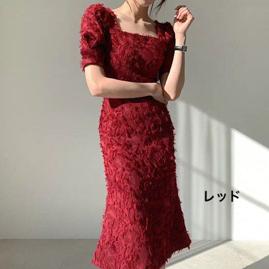 結婚式ドレス シック レトロ スクエアネック エレガント 発表会 演奏会 レディース 結婚式 ステージ衣装 半袖 ミモレ丈 エレガント ウエディングドレス カラードレス フェミニン