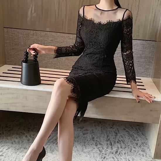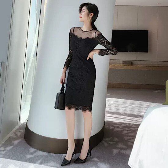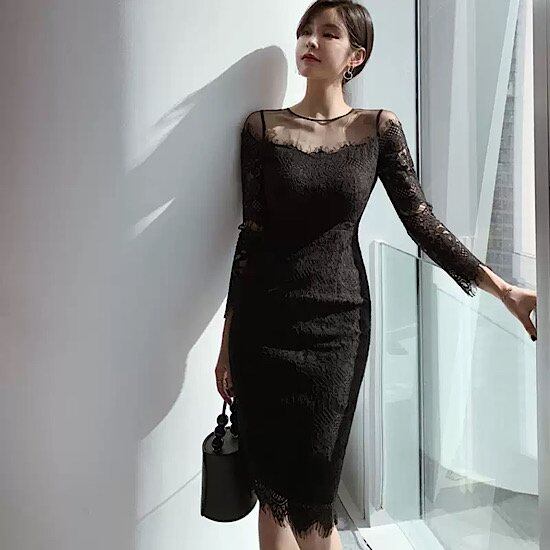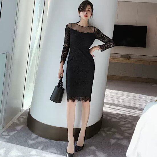 結婚式ドレス セクシー レース シースルー ラウンドネック スリムフィット 膝丈 発表会 演奏会 レディース タイト 結婚式 ステージ衣装 長袖 エレガント ウエディングドレス カラードレス