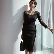 スレンダーで細見えなタイトボディラインに総レース刺繍がおしゃれなエレガントさを醸し出す、ミディアムひざ丈ドレス。