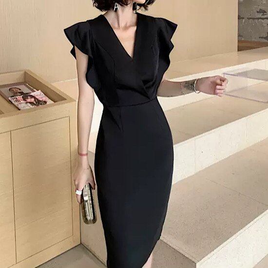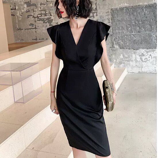 結婚式ドレス イブニングドレス フリル ノースリーブ Vネック 無地 シンプル 膝丈 発表会 演奏会 レディース 結婚式 ステージ衣装 ペンシルスカート エレガント ウエディングドレス カラードレス