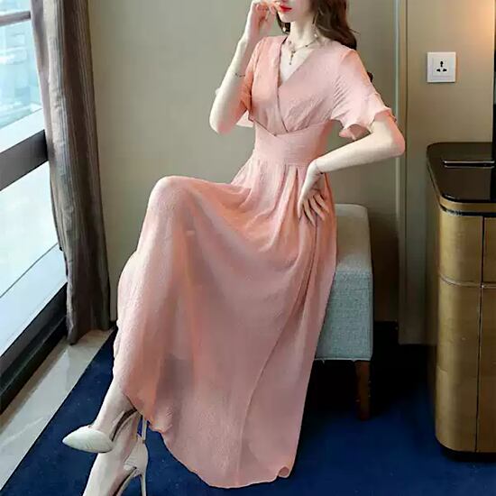 結婚式ドレス Vネック 無地 シンプル スリム トレンディ シフォン ミモレ丈 発表会 演奏会 レディース フレアドレス 結婚式 ステージ衣装 半袖 エレガント ウエディングドレス カラードレス