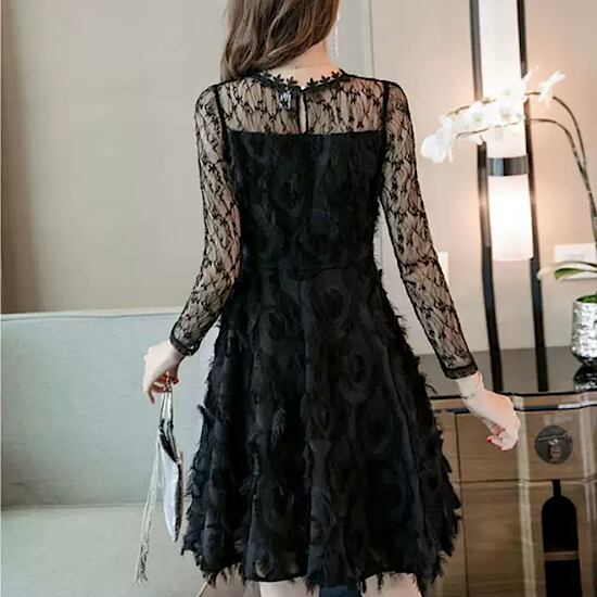 結婚式ドレス フェザー タッセルレース ミニスカートラウンドネック 軽やか 長袖 シースルー 発表会 演奏会 レディース 結婚式 ステージ衣装 エレガント ウエディングドレス カラードレス
