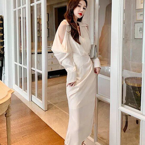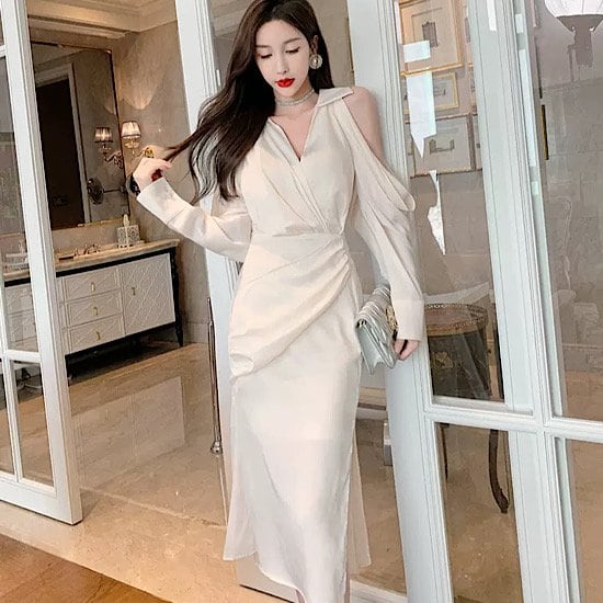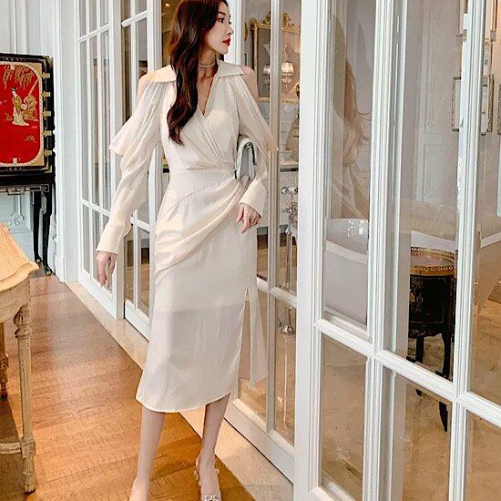 結婚式ドレス フレンチ オープンショルダー Vネック スリット入り セクシー タイト スリム 発表会 演奏会 レディース 結婚式 ステージ衣装 ミモレ丈 エレガント ウエディングドレス 長袖