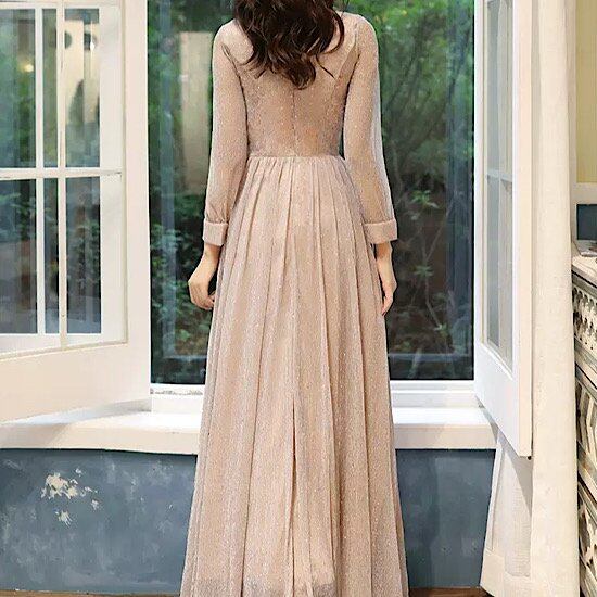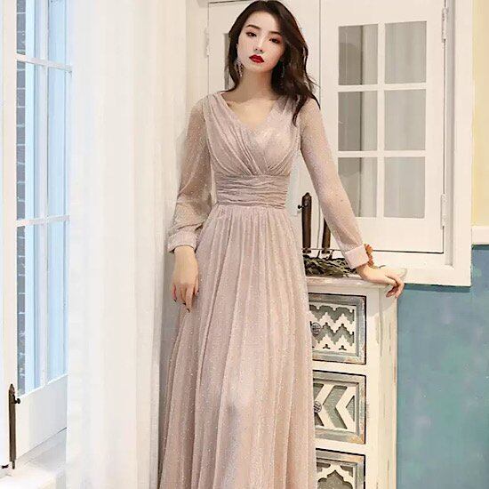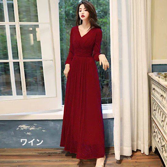 演奏会ドレス 長袖 イブニングドレス Vネック デコルテ ラメ入り キラキラ 発表会 演奏会 レディース フレンチ 結婚式 ステージ衣装 ロング丈 エレガント ウエディングドレス カラードレス