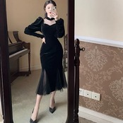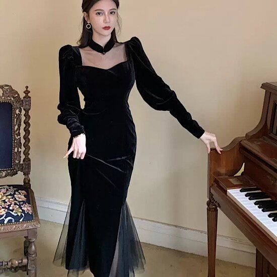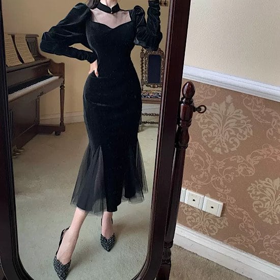 結婚式ドレス マーメイドスカート レース ハートカット パフスリーブ 無地 ミモレ丈 発表会 演奏会 レディース 結婚式 ステージ衣装 エレガント ウエディングドレス カラードレス 長袖
