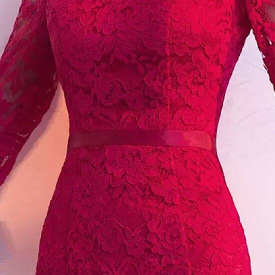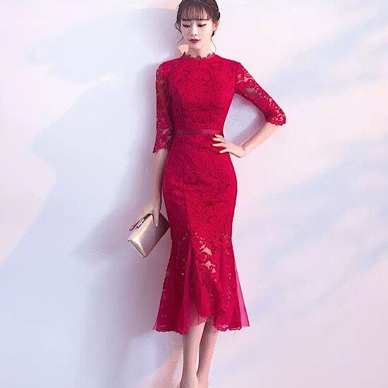 結婚式ドレス マーメイドスカート スリムフィット レース ハイネック 五分袖 発表会 演奏会 レディース 結婚式 ステージ衣装 ミモレ丈 エレガント ウエディングドレス カラードレス