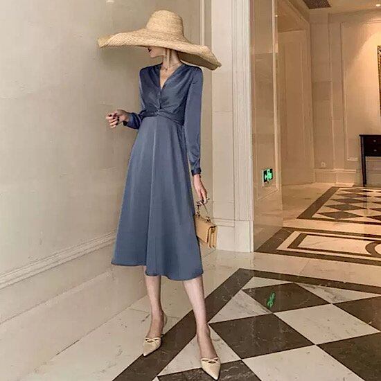 結婚式ドレス フレンチ ミニマリスト サテン 長袖 ミモレ丈 肌触りVネック 発表会 演奏会 レディース フレアドレス 結婚式 ステージ衣装 エレガント ウエディングドレス カラードレス ハイウエスト