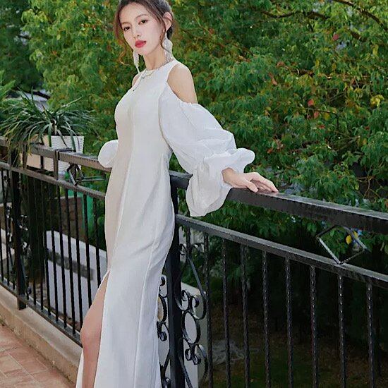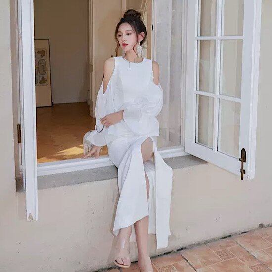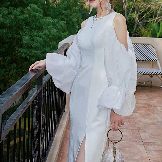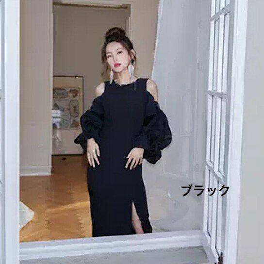 結婚式ドレス パフスリーブ ラウンドネック スリット フレンチ モード セクシー 無地 ストレート 長袖 発表会 演奏会 レディース 結婚式 ステージ衣装 ロング丈 エレガント カラードレス