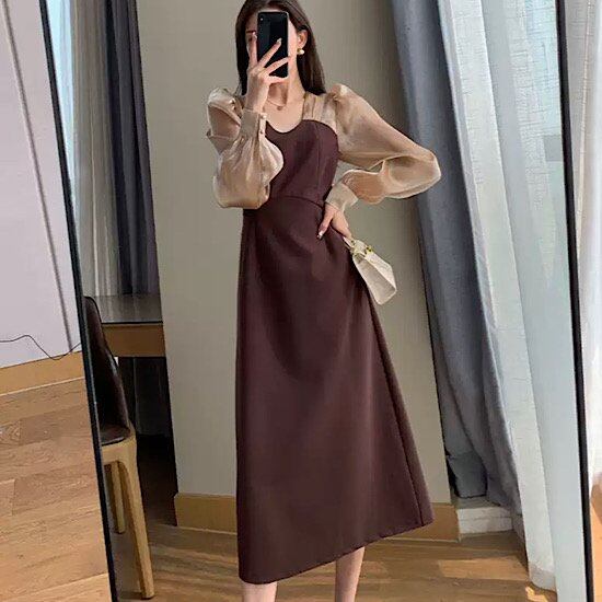 結婚式ドレス ハイウエスト バイカラー レース シースルー ミモレ丈 長袖 発表会 演奏会 レディース スレンダー 結婚式 ステージ衣装 エレガント ウエディングドレス カラードレス レトロ