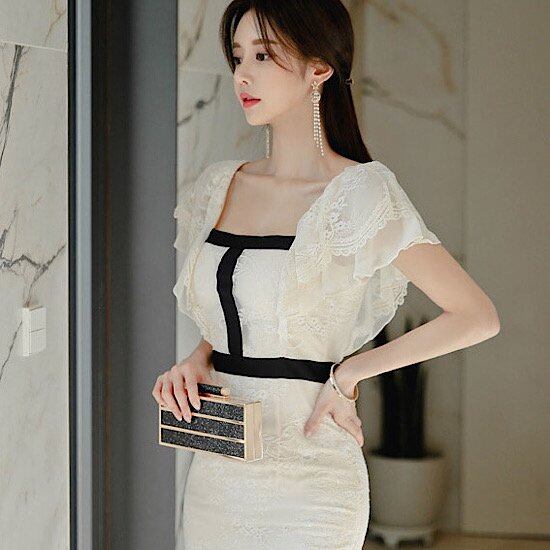 結婚式ドレス スクエアネック フリル レース スリムフィット タイト ライン入り 膝丈 発表会 演奏会 レディース 結婚式 ステージ衣装 エレガント ウエディングドレス カラードレス