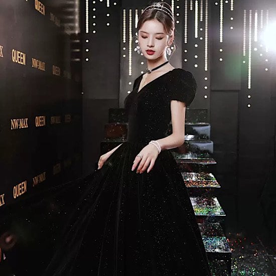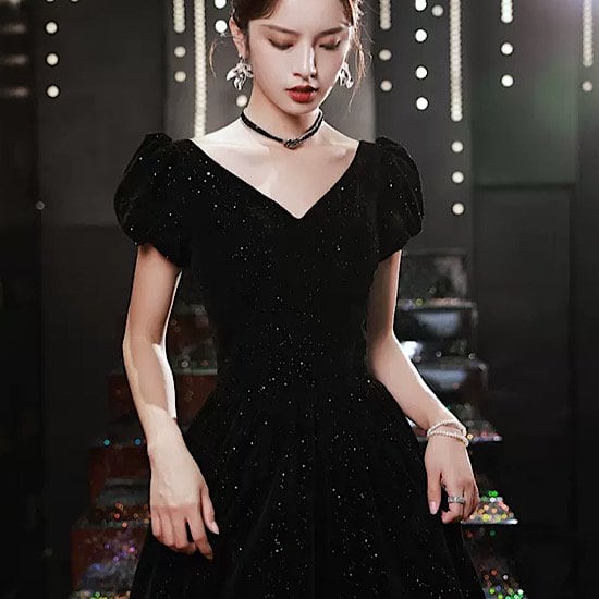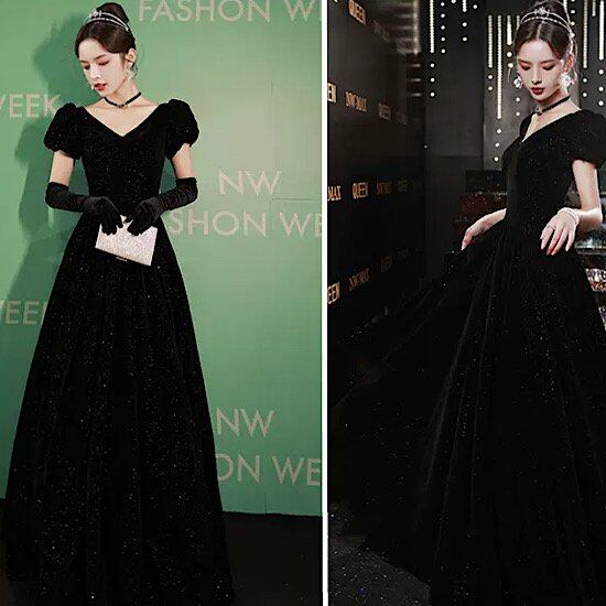 演奏会ドレス ベルベットVネック デコルテ ラメ入り キラキラ イブニングドレス 発表会 演奏会 レディース フレアドレス 結婚式 ステージ衣装 半袖 ロング丈 エレガント ウエディングドレス