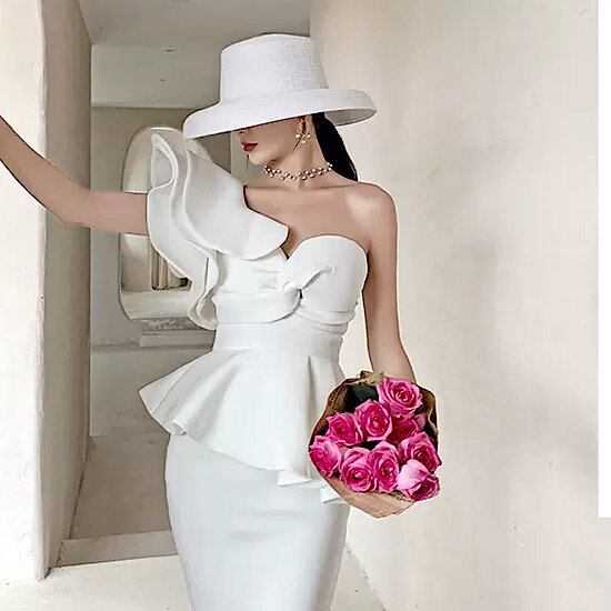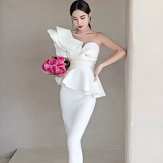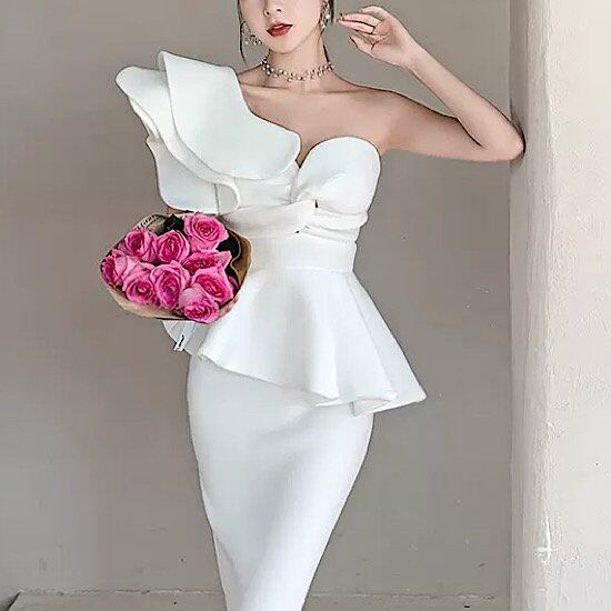 結婚式ドレス サテン 個性的 ワンショルダー フリル 清楚 発表会 演奏会 レディース 結婚式 ステージ衣装 ミモレ丈 エレガント ウエディングドレス カラードレス スリムフィット