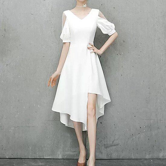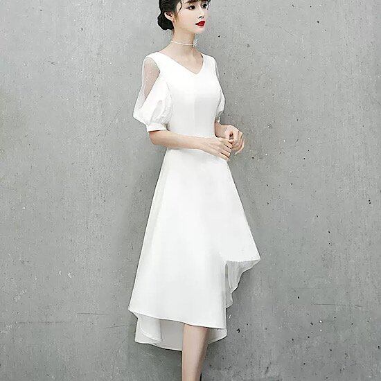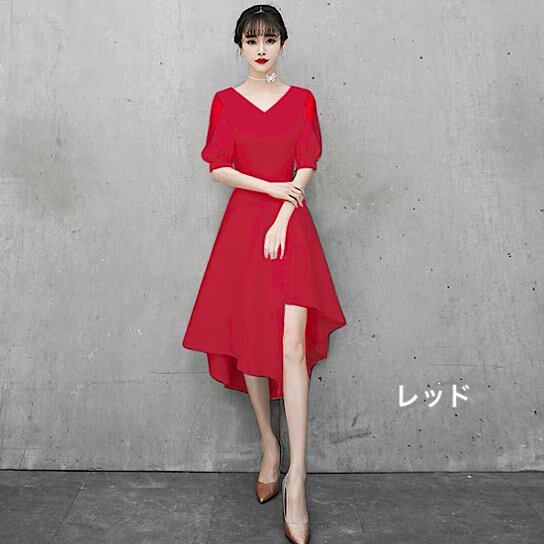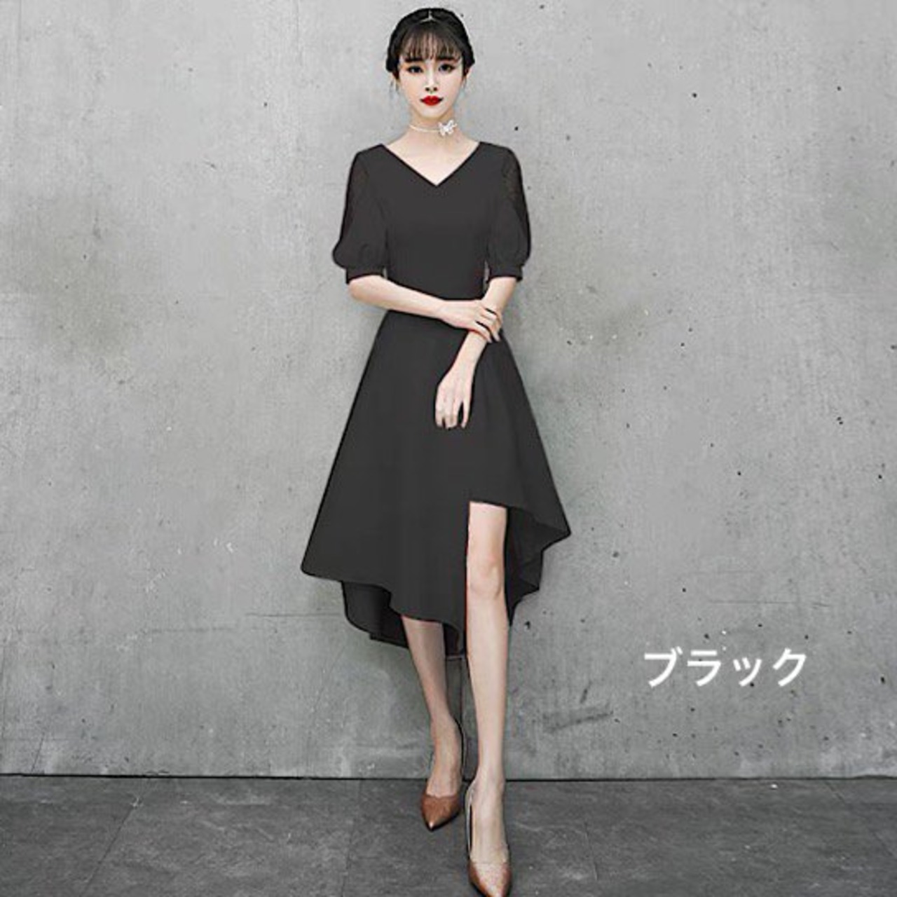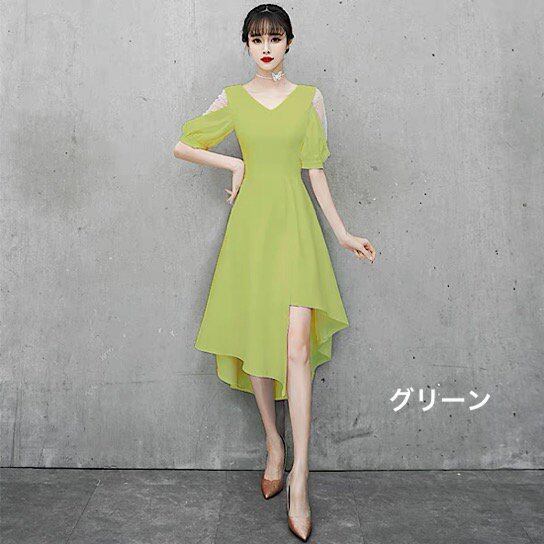 結婚式ドレス アシンメトリー Vネック 発表会 演奏会 レディース フレアドレス 結婚式 ステージ衣装 ミモレ丈 エレガント ウエディングドレス カラードレス 五分袖 シースルー