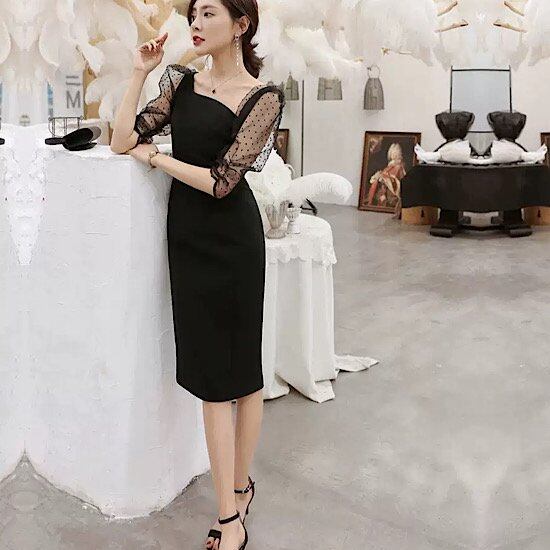 結婚式ドレス シースルー スリーブ タイト スリム メッシュ セクシー トレンディ 発表会 演奏会 レディース 結婚式 ステージ衣装 ミモレ丈 エレガント ウエディングドレス カラードレス 五分袖