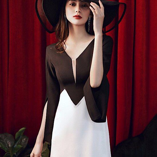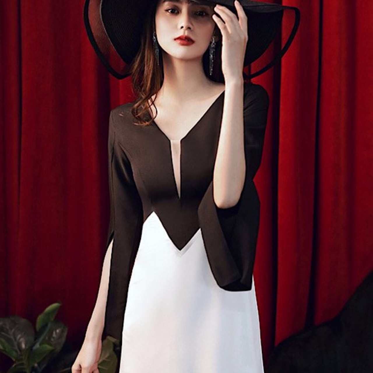 結婚式ドレス バイカラー モノトーン イブニングドレス 無地 シンプル 発表会 演奏会 レディース 結婚式 ステージ衣装 エレガント ウエディングドレス カラードレス 膝丈 五分袖