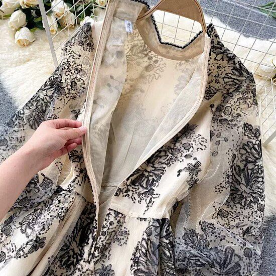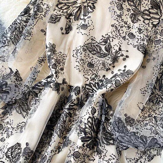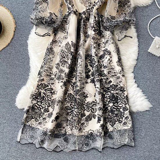 SNS映えするミディアムパーティードレスは花柄刺繍のフレアシースルードレス。