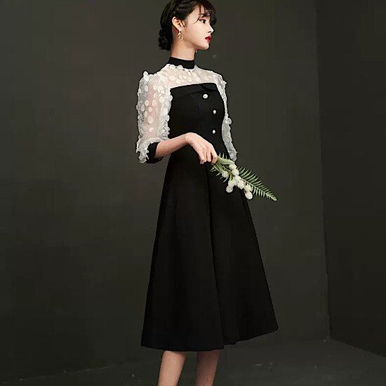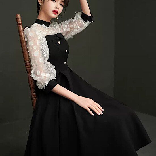 結婚式ドレス ハイネック モノトーン シースルー ドット柄 フロントボタン 発表会 演奏会 レディース フレアドレス 結婚式 ステージ衣装 膝丈 エレガント ウエディングドレス カラードレス