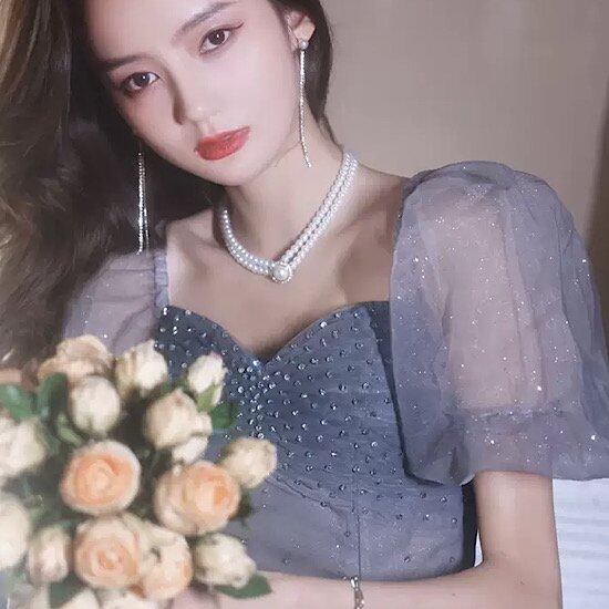 シースルー半袖にパールが豪華なAラインロングドレス。