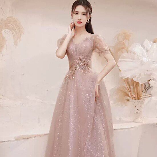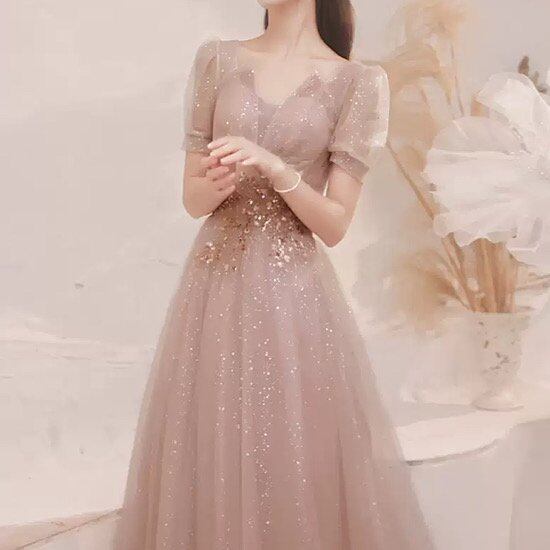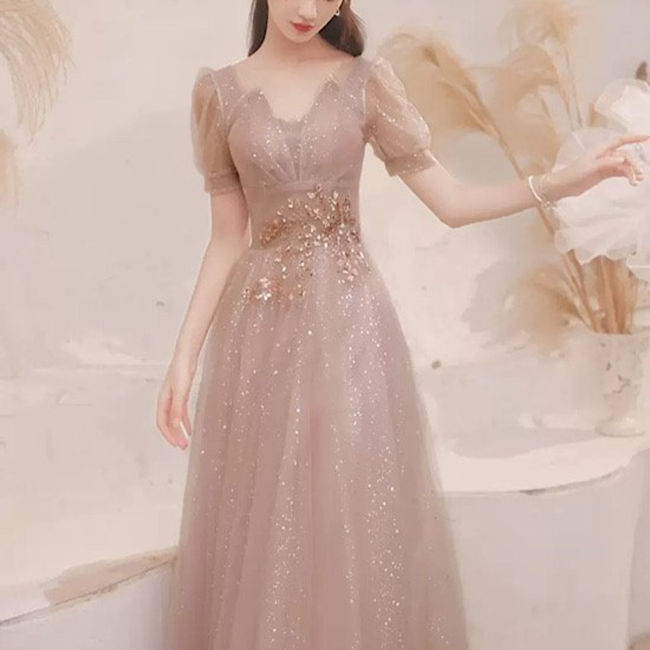 演奏会ドレス 発表会ドレス プリンセス パフスリーブ デコルテ キラキラ 発表会 演奏会 レディース Aライン 結婚式 ステージ衣装 半袖 ロング丈 エレガント ウエディングドレス カラードレス