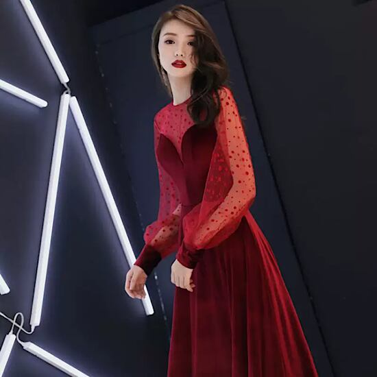 演奏会ドレス 発表会ドレス ドット柄 シースルー ハートカット 長袖 レディース フレアドレス 結婚式 ステージ衣装 ロング丈 エレガント ウエディングドレス カラードレス 透け感 スレンダー