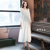 スタンドカラーとフレアシルエットが女性らしさを引き立てるドレス。