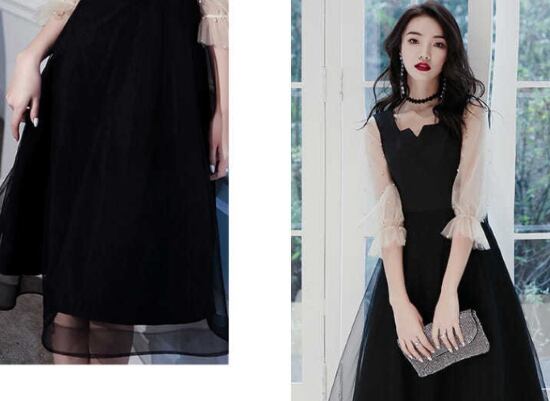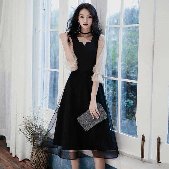 パーティードレス レディース ワンピース 結婚式ドレス 演奏会ドレス 膝丈ワンピース シースルー メッシュ ビーズ装飾 スクエアネック お呼ばれ フォーマル きれいめ エレガント ブラック 黒