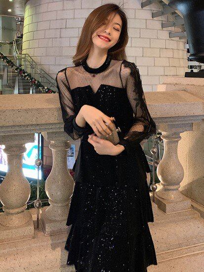 パーティードレス レディース ワンピースドレス 結婚式ドレス 演奏会ドレス お呼ばれ フォーマル パーティー きれいめ メッシュ シースルー ティアードスカート ラウンドネック ハイウエスト