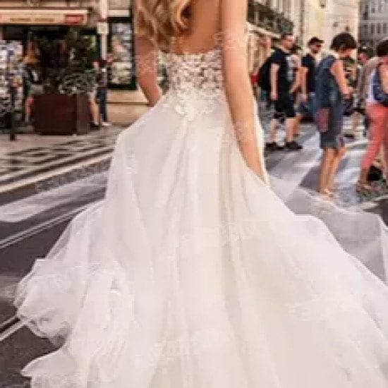 刺繍のビスチェとスカートが上品なウェディングドレス。