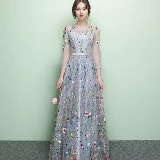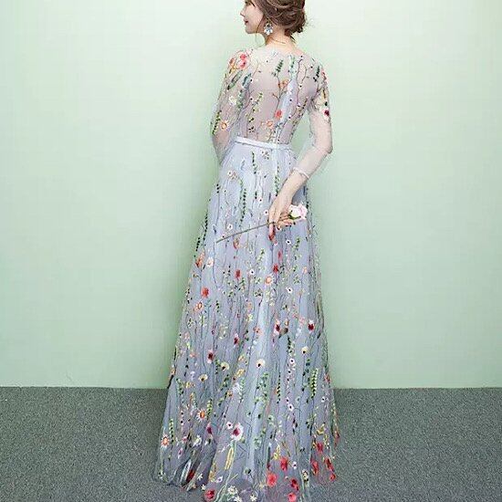 演奏会ドレス 発表会ドレス ラウンドネック デコルテ シースルー 発表会 演奏会 レディース 花柄 結婚式 ステージ衣装 五部袖 ロング丈 エレガント ウエディングドレス カラードレス